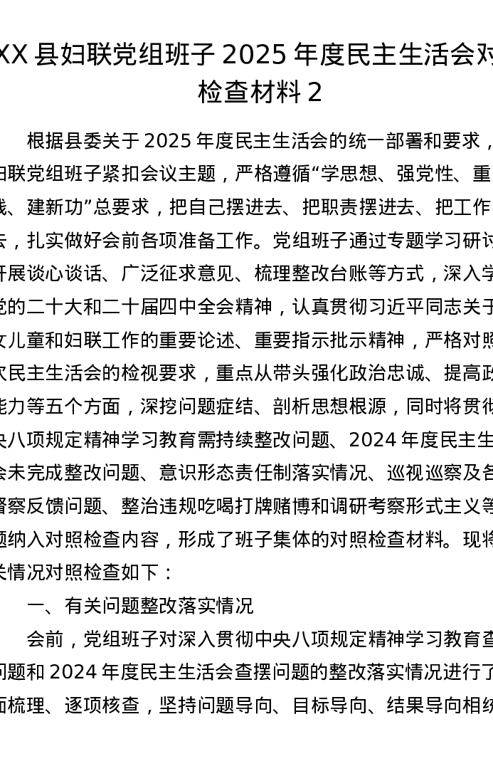 XX县妇联党组班子2025年度xxxxx对照检查材料2