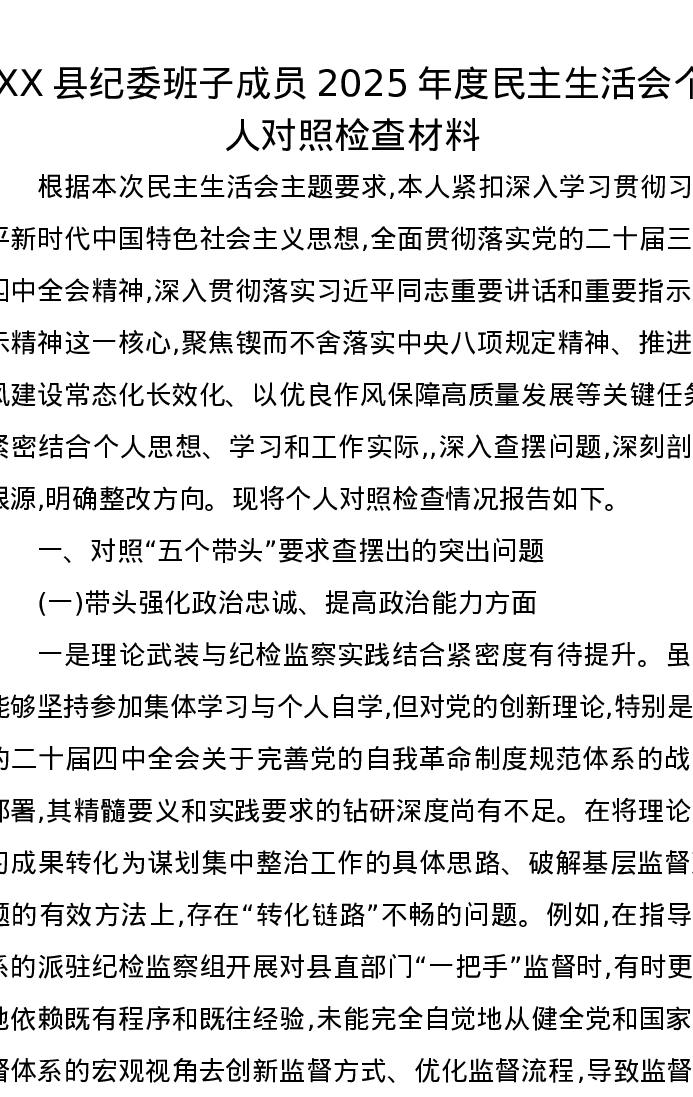XX县纪委班子成员2025年度xxxxx个人对照检查材料