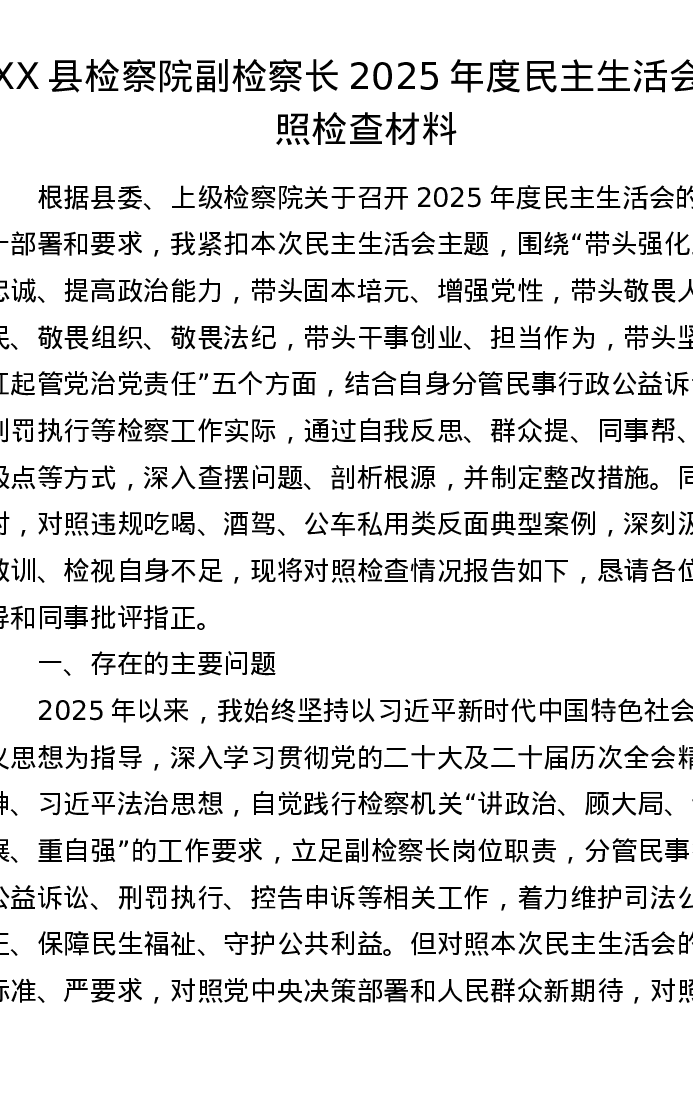 XX县检察院副检察长2025年度xxxxx对照检查材料