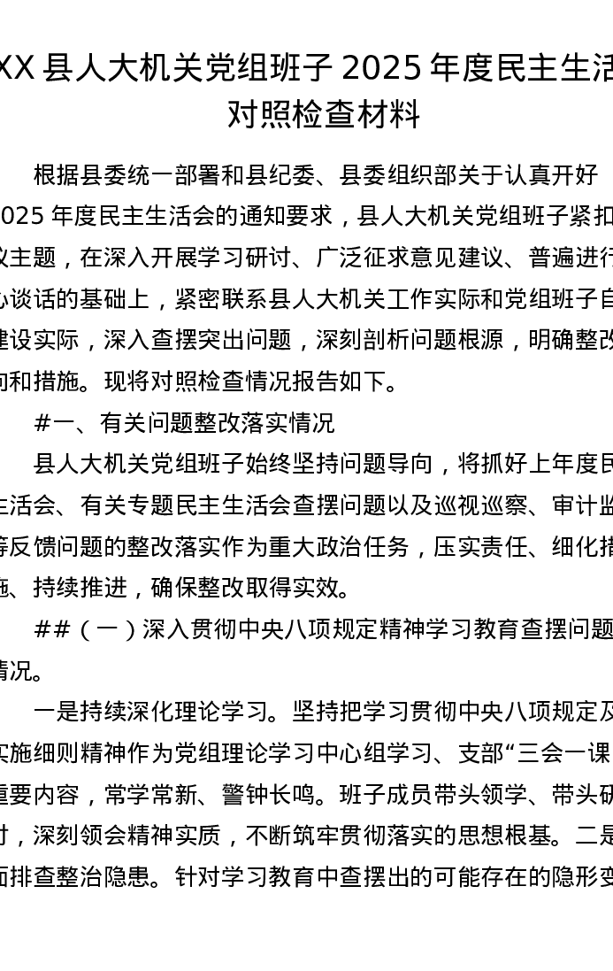 XX县人大机关党组班子2025年度xxxxx对照检查材料(6701字)