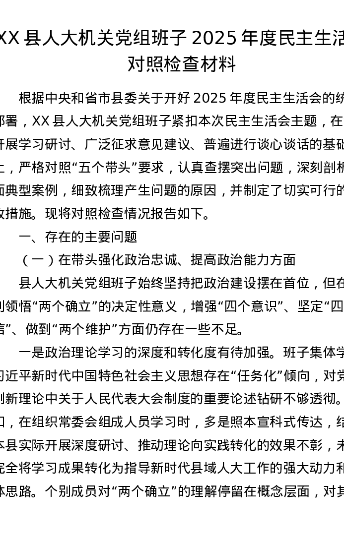 XX县人大机关党组班子2025年度xxxxx对照检查材料(7302字)
