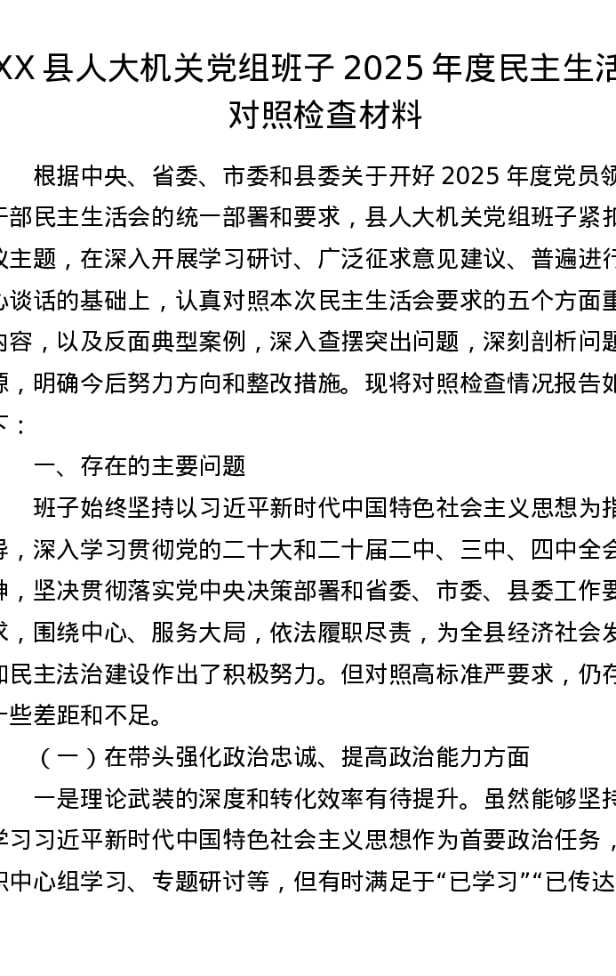 XX县人大机关党组班子2025年度xxxxx对照检查材料