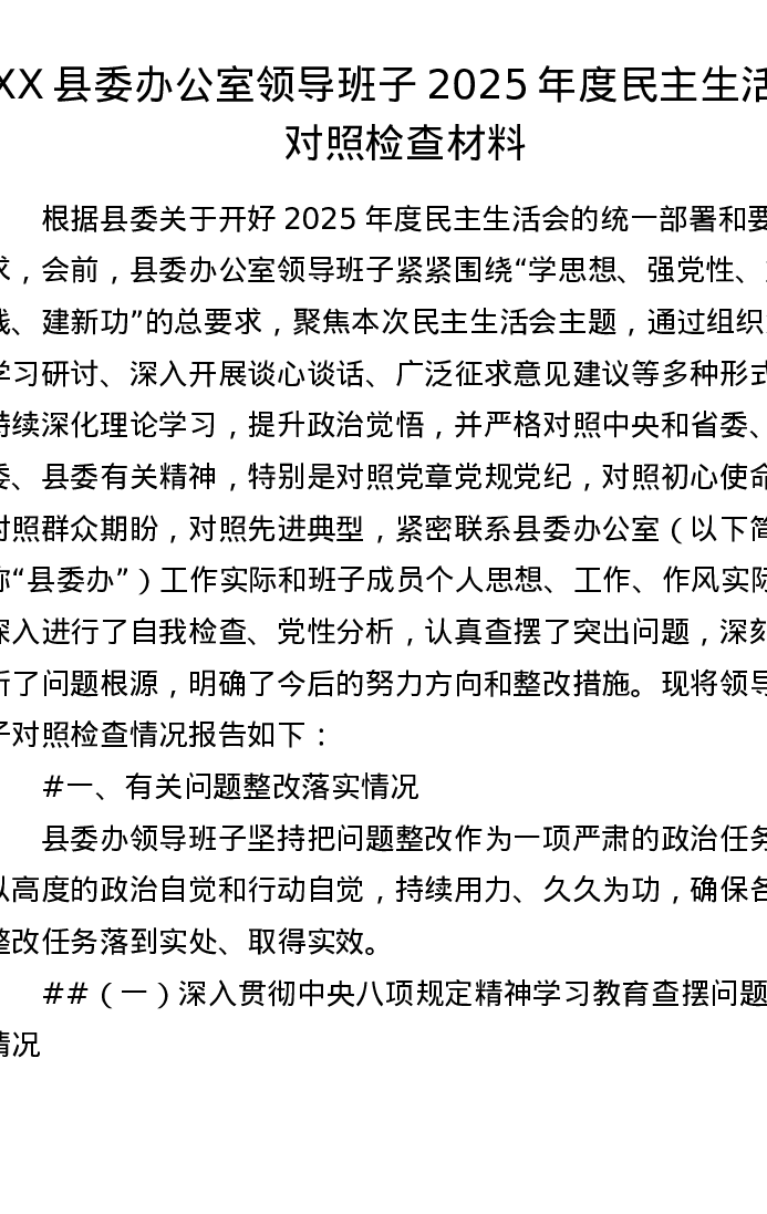 XX县委办公室领导班子2025年度xxxxx对照检查材料(6580字)