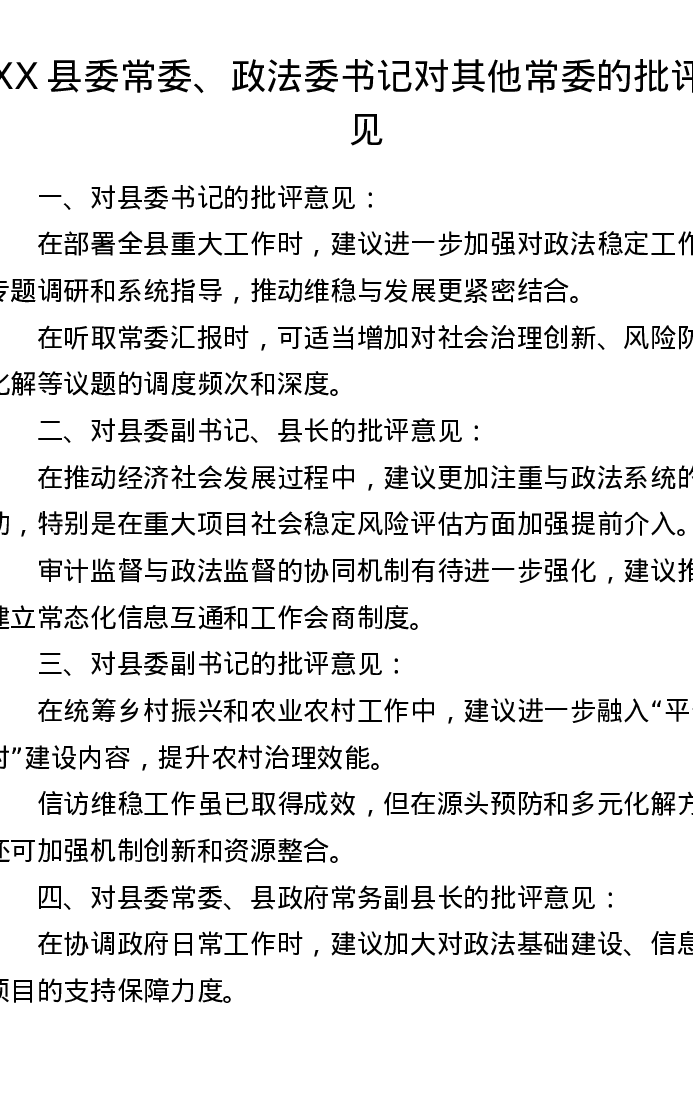 XX县委常委、政法委书记对其他常委的批评意见
