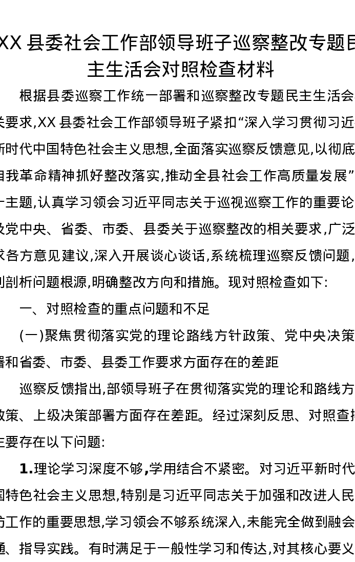 XX县委社会工作部领导班子巡察整改专题xxxxx对照检查材料