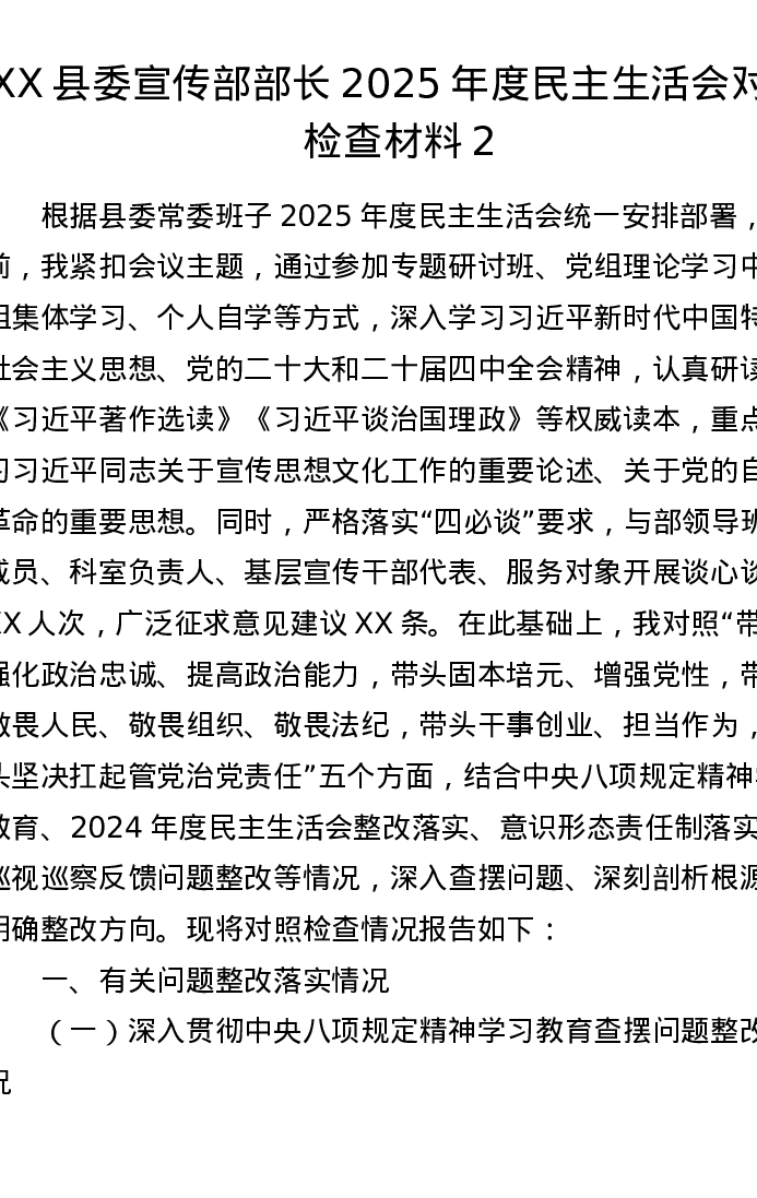 XX县委宣传部部长2025年度xxxxx对照检查材料2