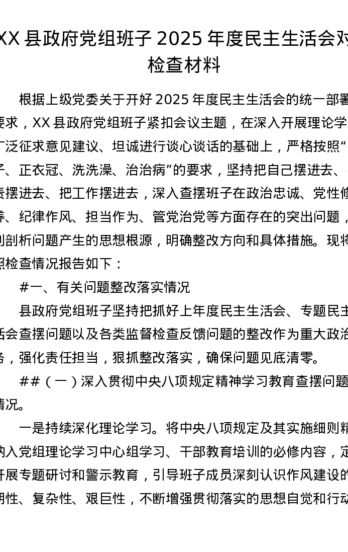 XX县政府党组班子2025年度xxxxx对照检查材料(6622字)