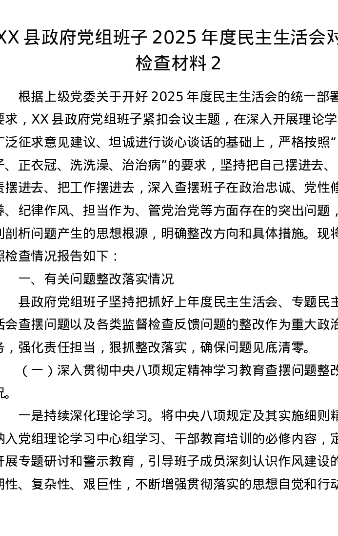 XX县政府党组班子2025年度xxxxx对照检查材料2