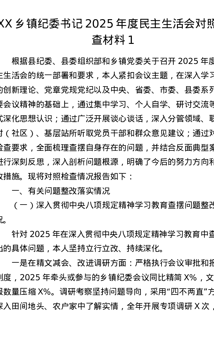 XX乡镇纪委书记2025年度xxxxx对照检查材料1