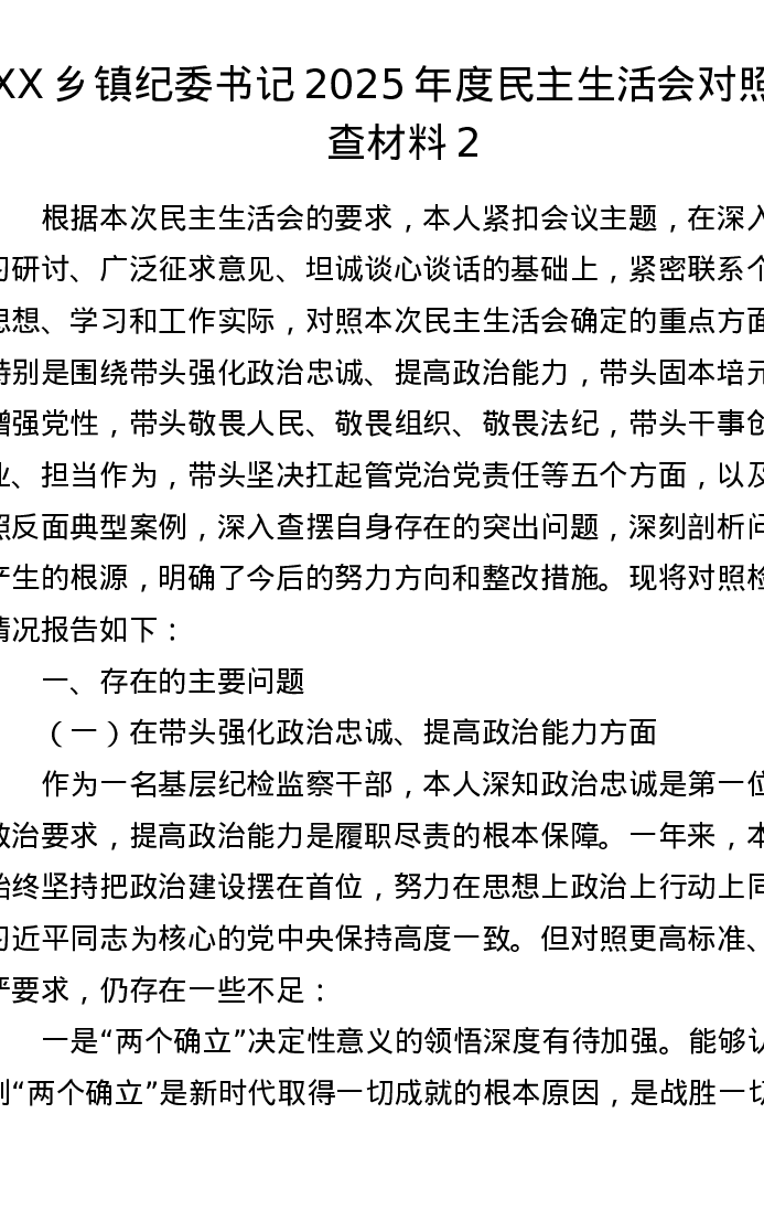 XX乡镇纪委书记2025年度xxxxx对照检查材料2