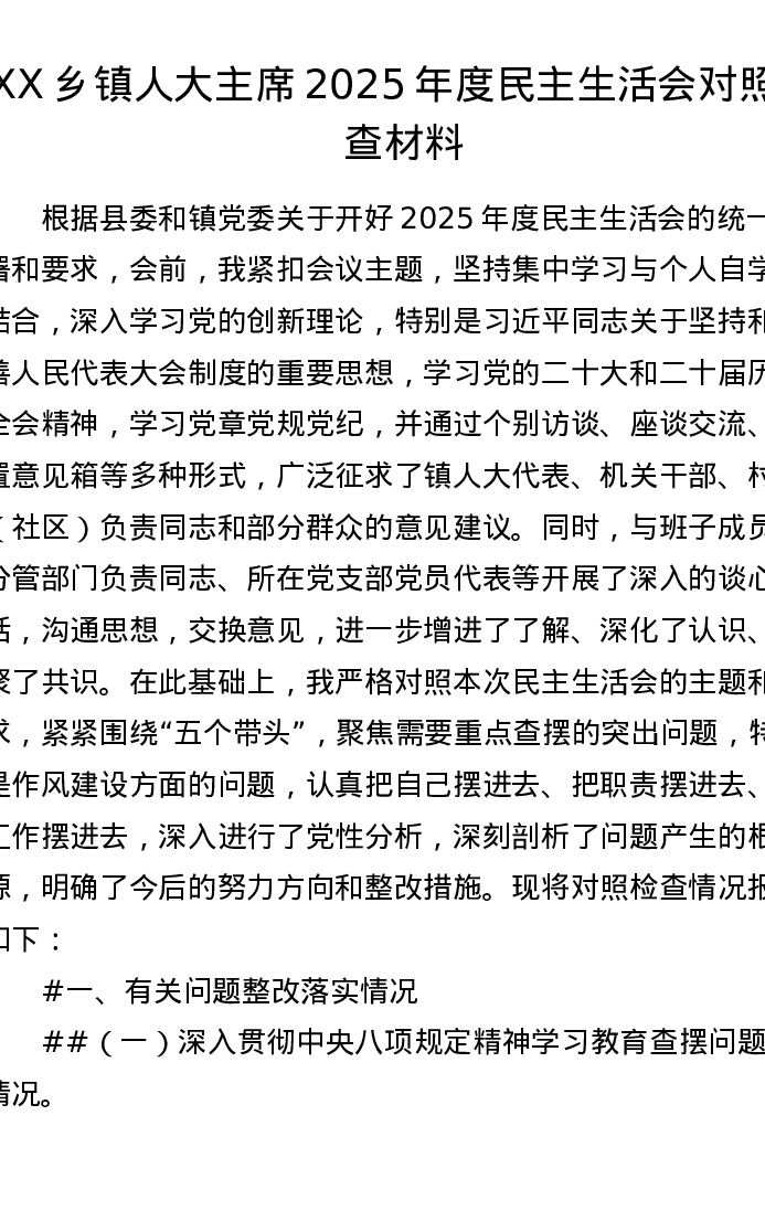 XX乡镇人大主席2025年度xxxxx对照检查材料(6818字)
