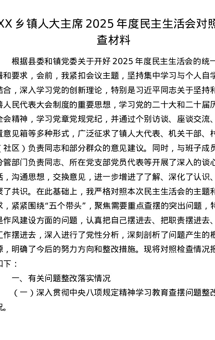 XX乡镇人大主席2025年度xxxxx对照检查材料