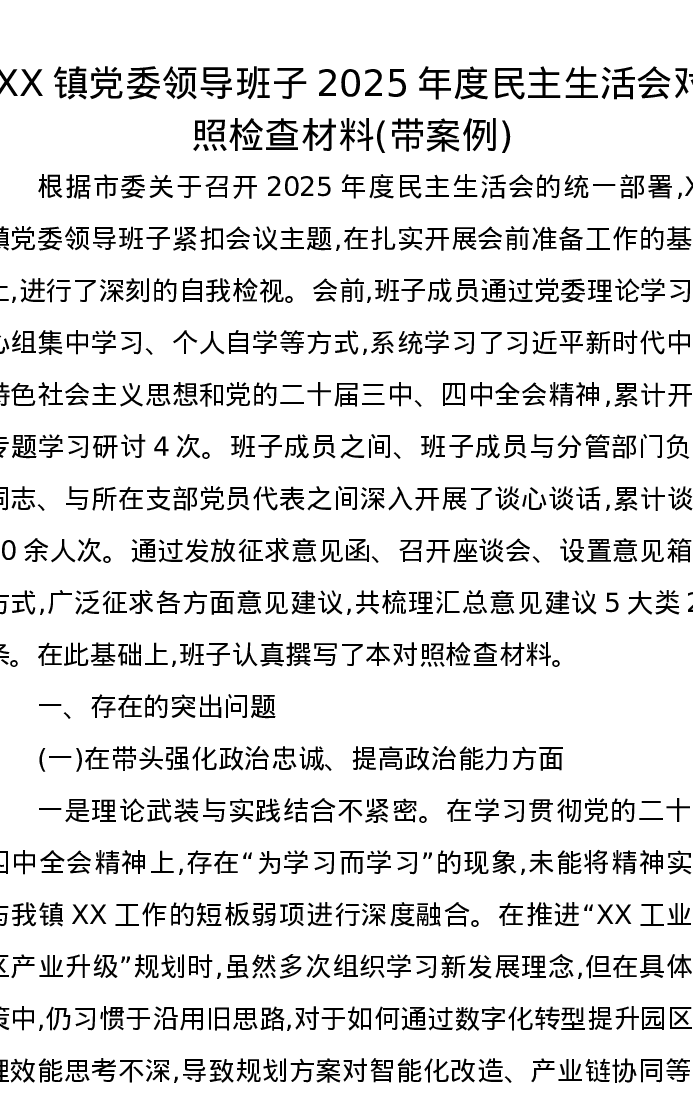 XX镇党委领导班子2025年度xxxxx对照检查材料(带案例)