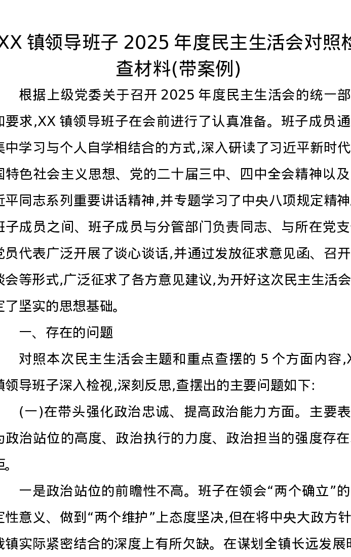 XX镇领导班子2025年度xxxxx对照检查材料(带案例)_2