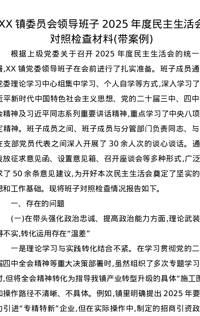 XX镇委员会领导班子2025年度xxxxx对照检查材料(带案例)