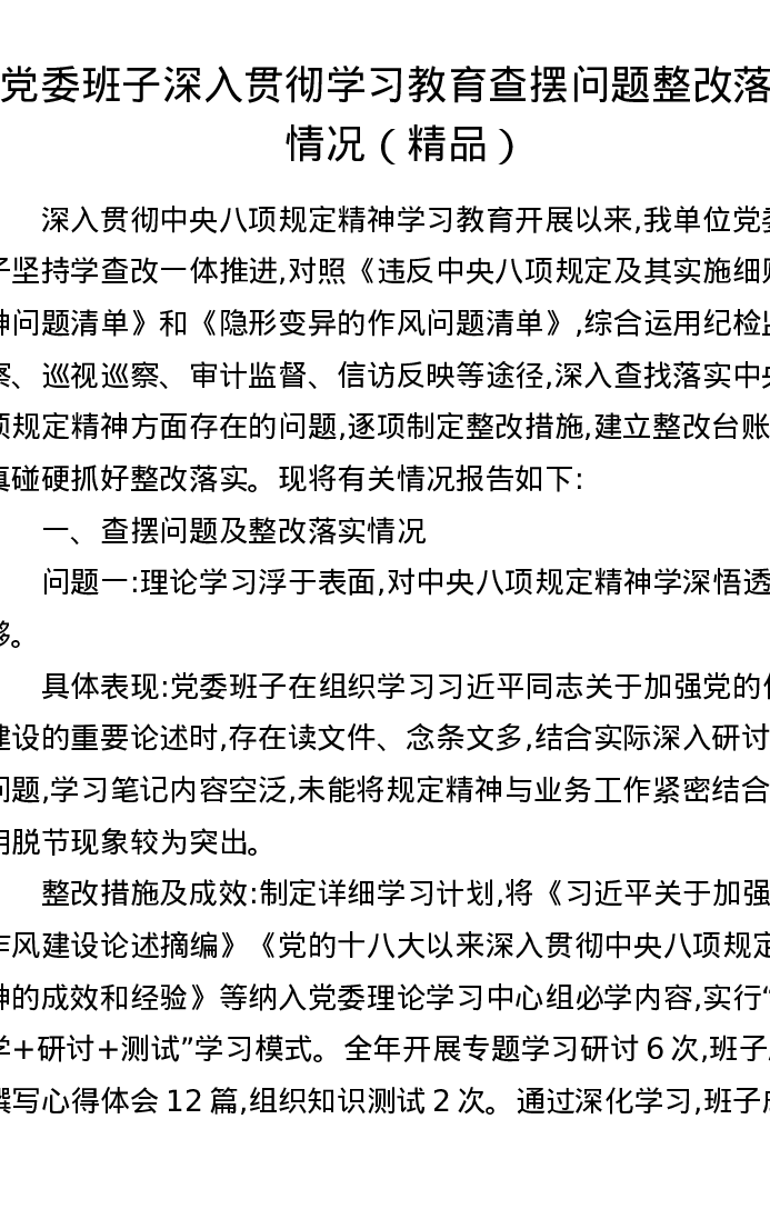党委班子深入贯彻学习教育查摆问题整改落实情况