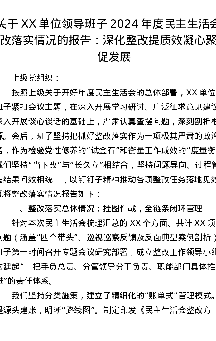 关于XX单位领导班子2024年度xxxxx整改落实情况的报告:深化整改提质效 凝心聚力促发展