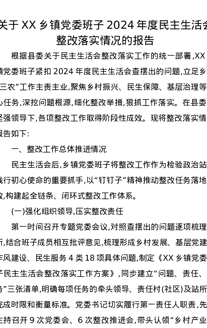 关于XX乡镇党委班子2024年度xxxxx整改落实情况的报告