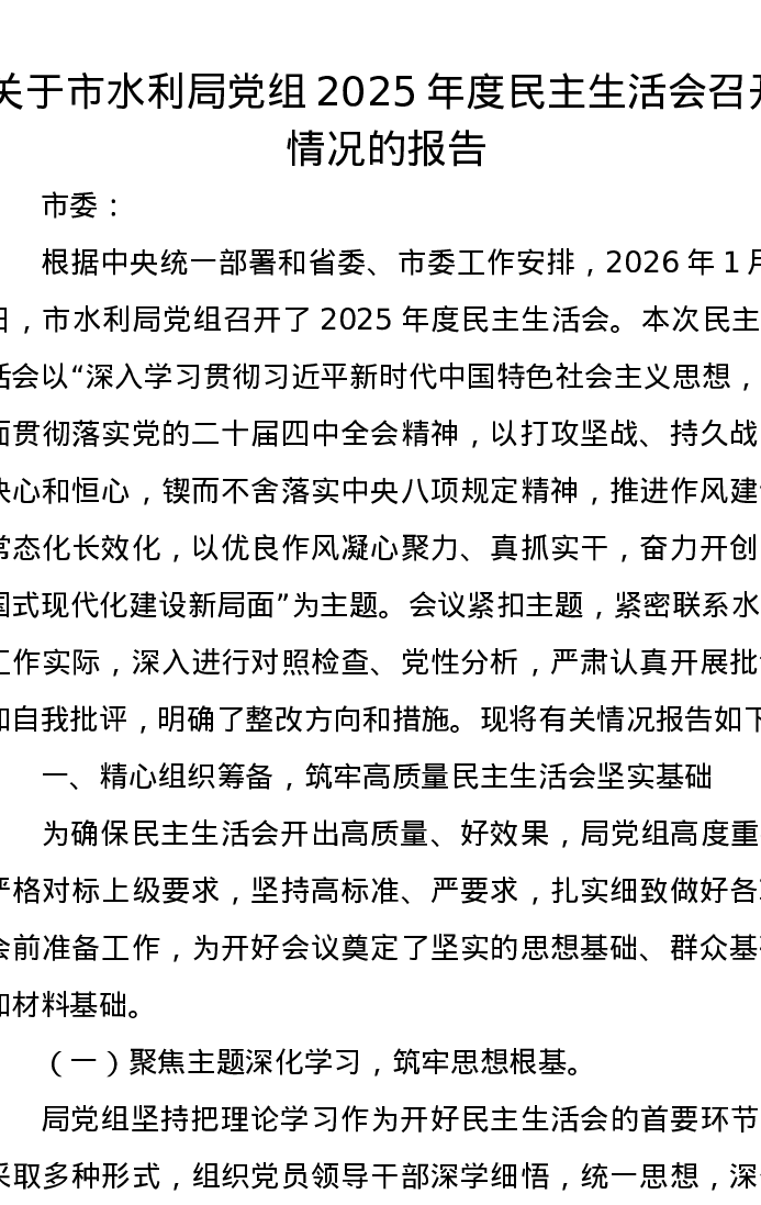 关于市水利局党组2025年度xxxxx召开情况的报告