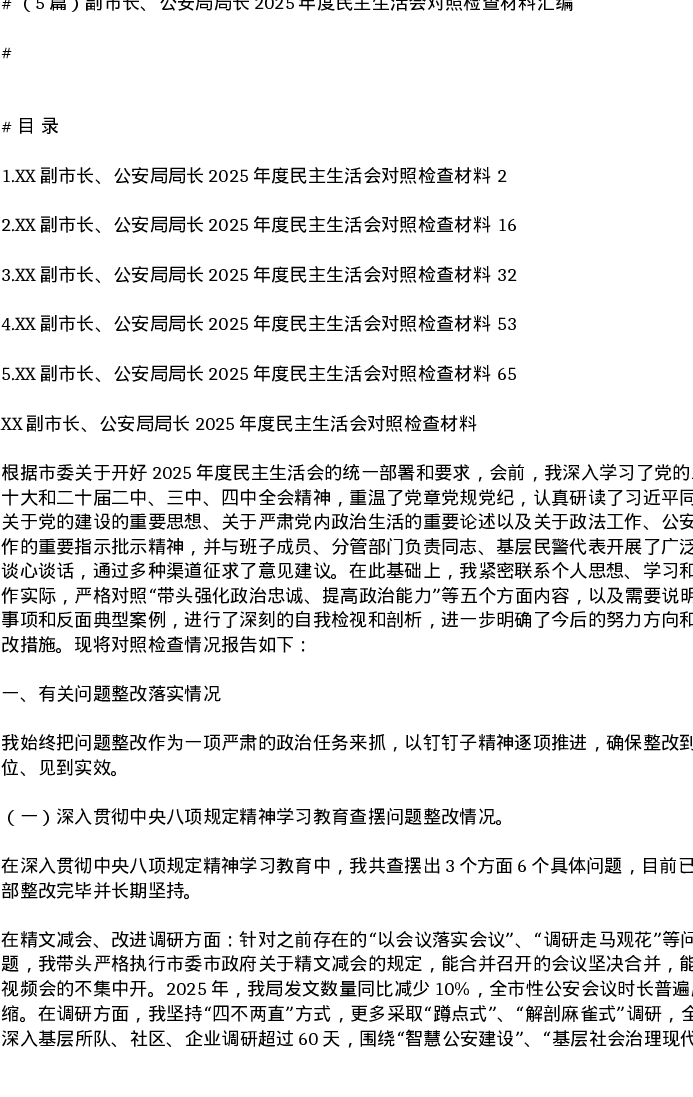 汇编:副市长、公安局局长2025年度xxxxx对照检查材料5篇