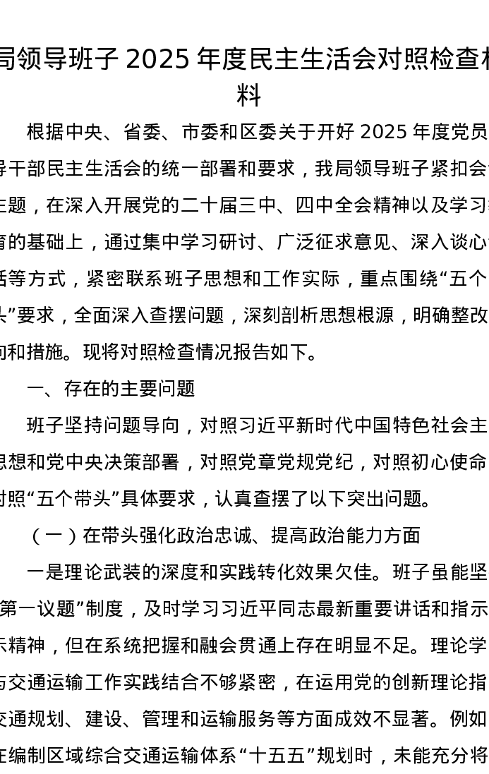 局领导班子2025年度xxxxx对照检查材料
