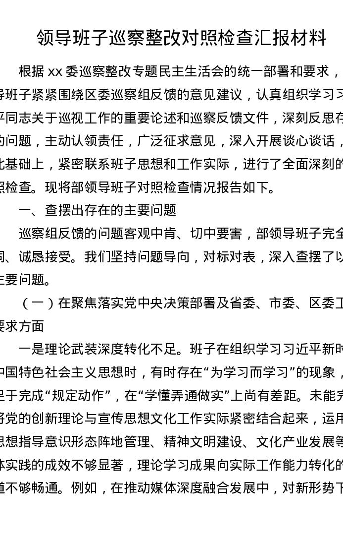 领导班子巡察整改对照检查汇报材料