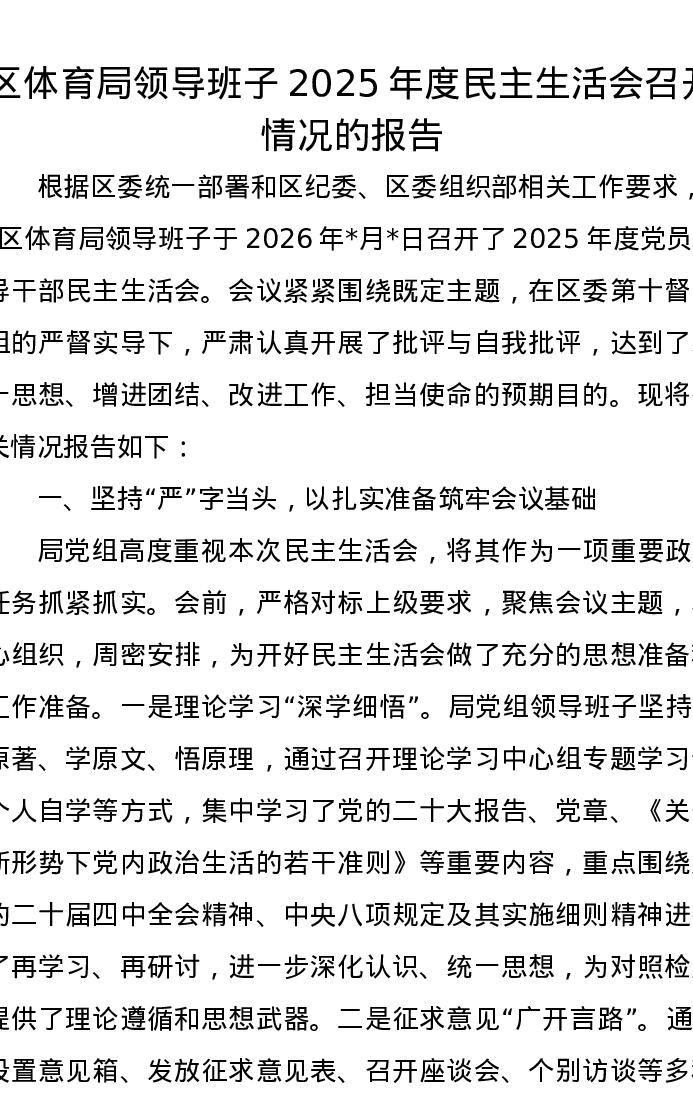 区体育局领导班子2025年度xxxxx召开情况的报告