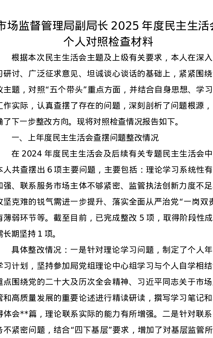 市场监督管理局副局长2025年度xxxxx个人对照检查材料