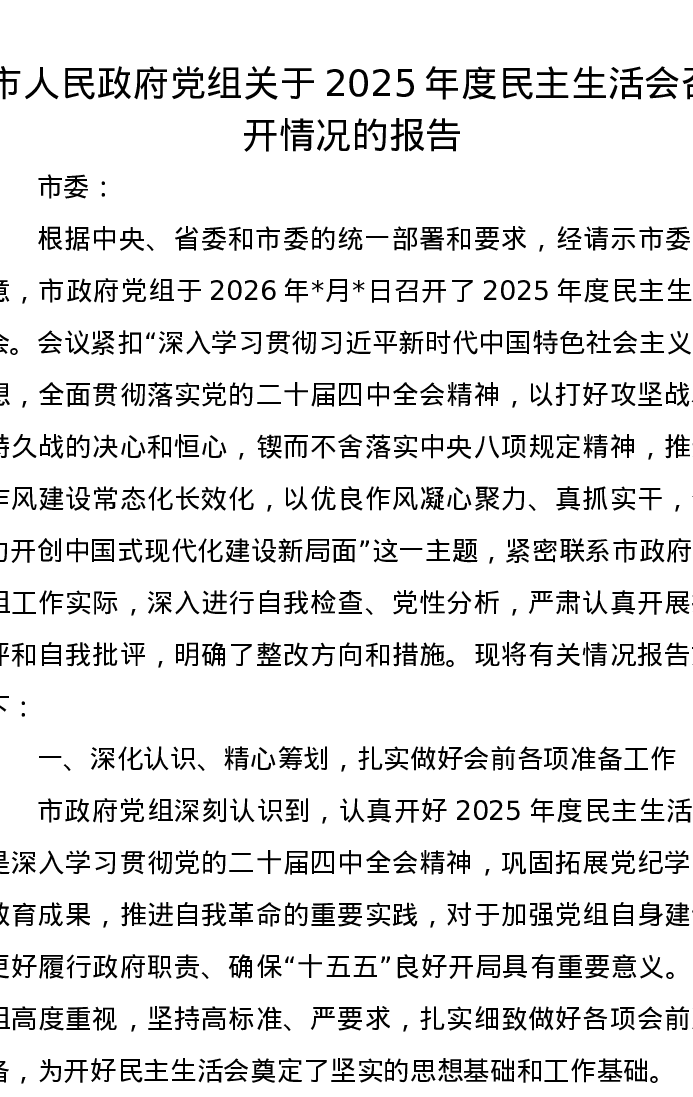 市人民政府党组关于2025年度xxxxx召开情况的报告