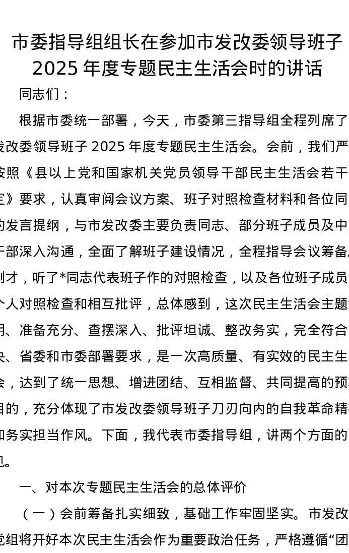 市委指导组组长在参加市发改委领导班子2025年度专题xxxxx时的讲话
