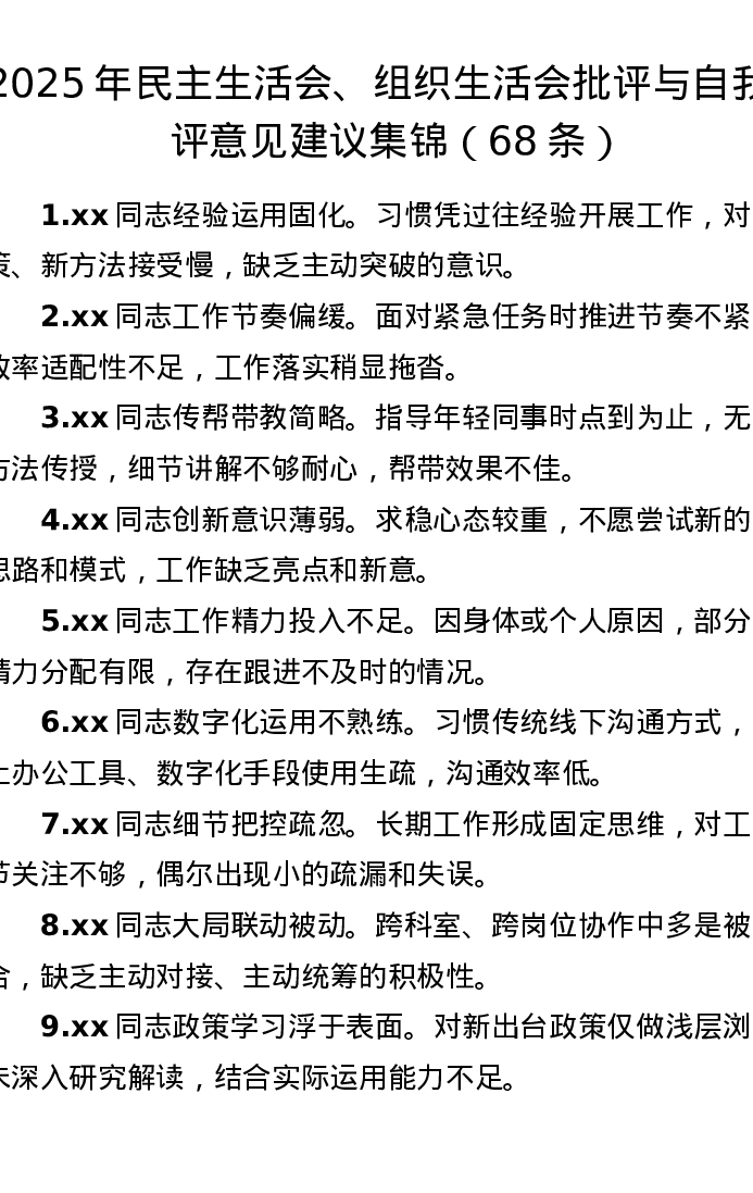 2025年xxxxx、组织xxx批评与自我批评意见建议集锦(68条)