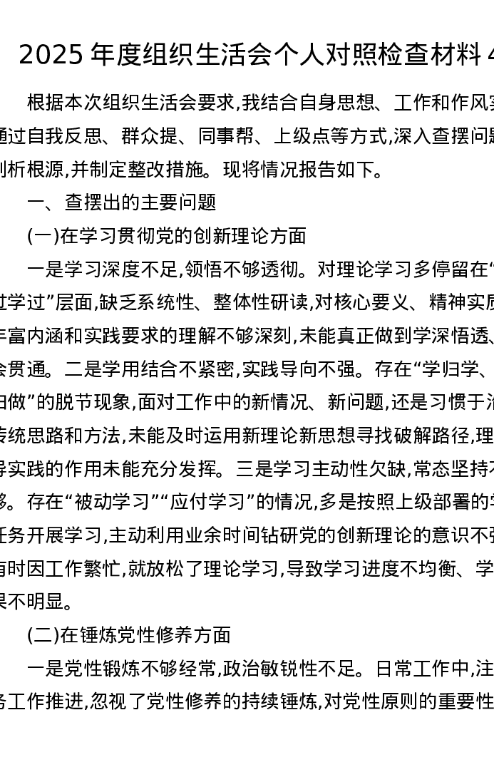 2025年度组织xxx个人对照检查材料4
