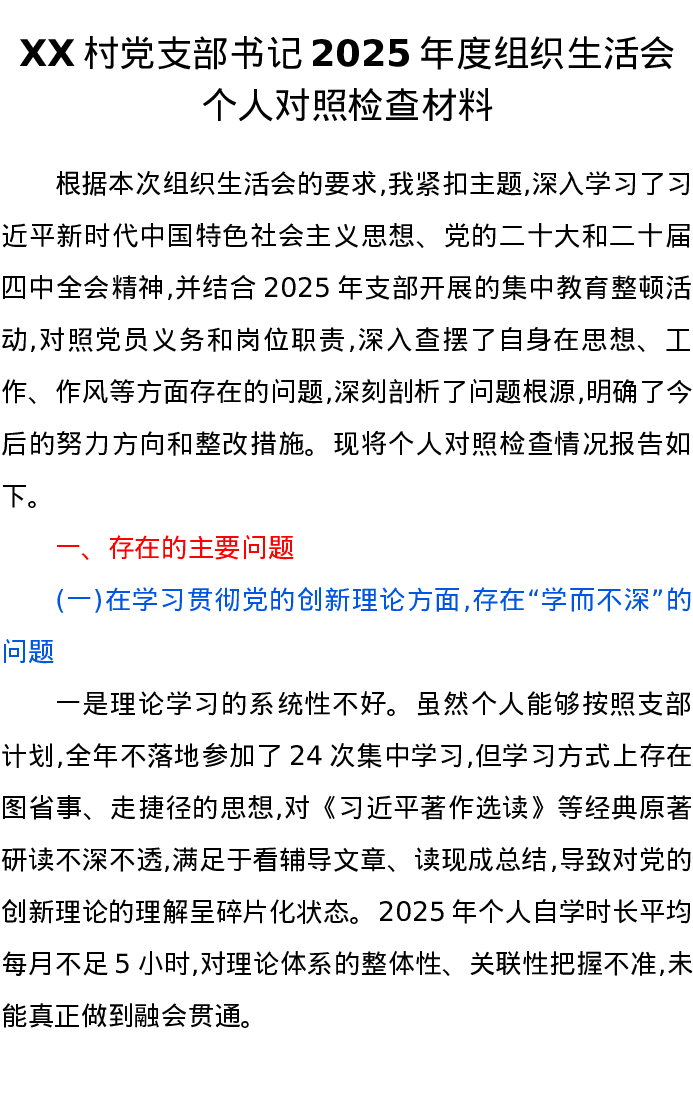 XX村党支部书记2025年度组织xxx个人对照检查材料