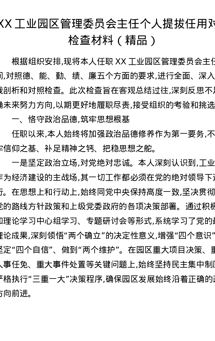 XX工业园区管理委员会主任个人提拔任用对照检查材料