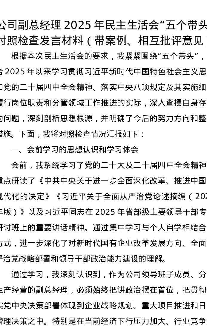公司副总经理2025年xxxxx五个带头对照检查发言材料(带案例、相互批评意见)