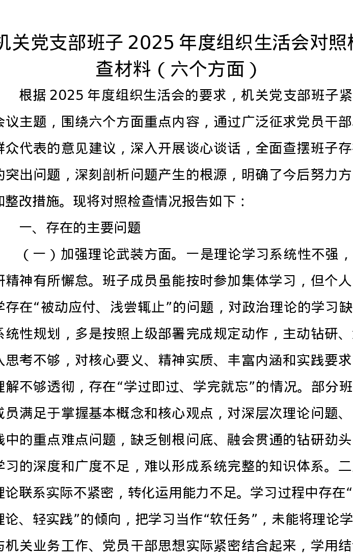 机关党支部班子2025年度组织xxx对照检查材料(6个方面)