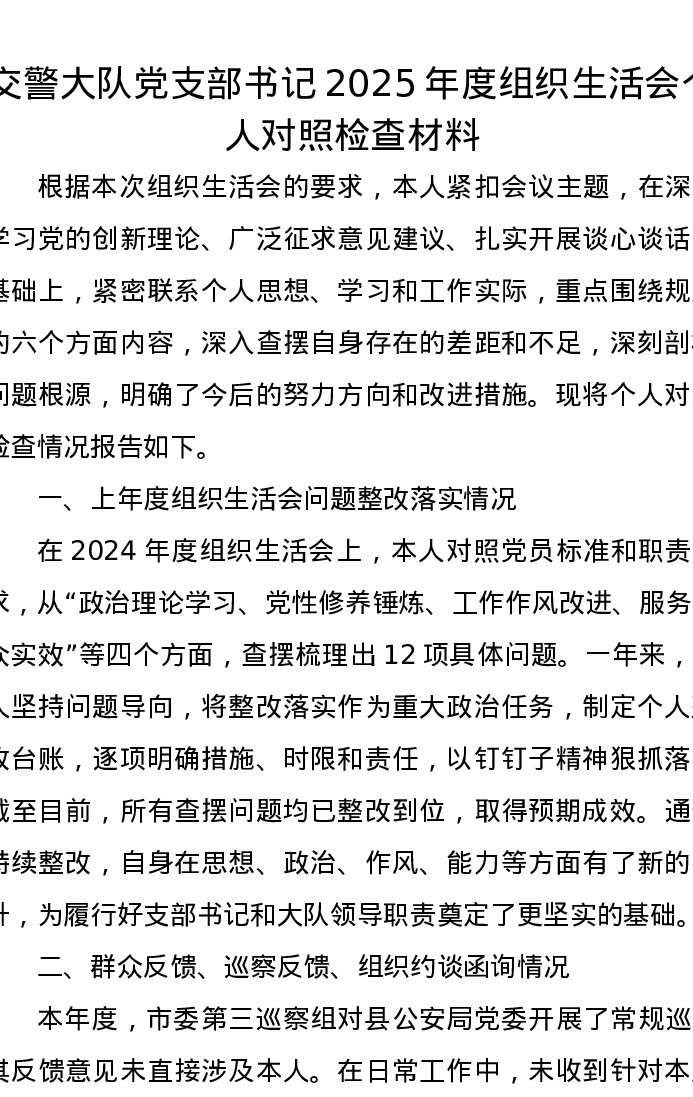 交警大队党支部书记2025年度组织xxx个人对照检查材料