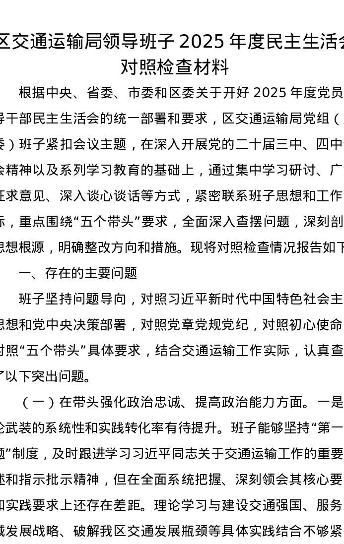 区交通运输局领导班子2025年度xxxxx对照检查材料