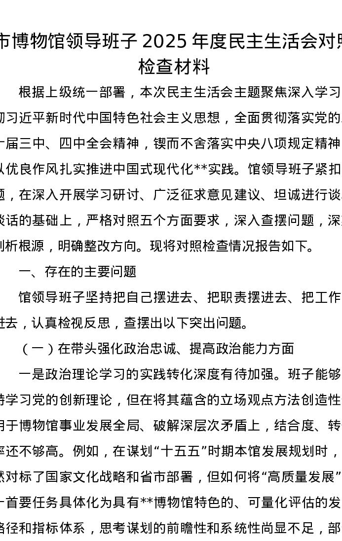 市博物馆领导班子2025年度xxxxx对照检查材料