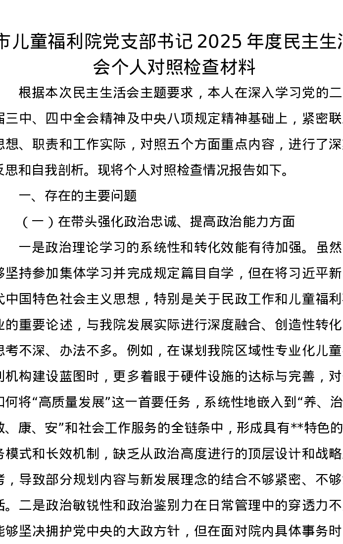 市儿童福利院党支部书记2025年度xxxxx个人对照检查材料