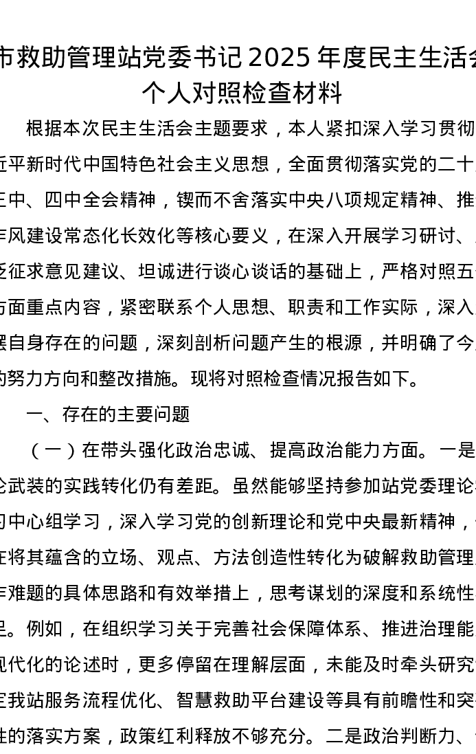 市救助管理站党委书记2025年度xxxxx个人对照检查材料