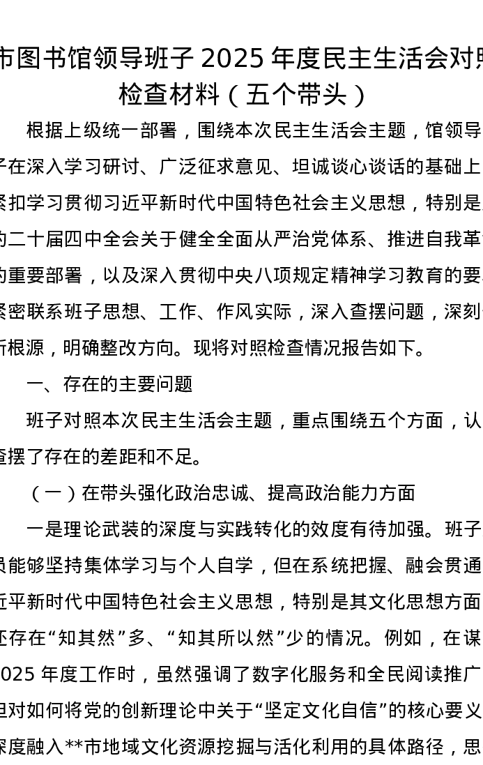 市图书馆领导班子2025年度xxxxx对照检查材料(五个带头)