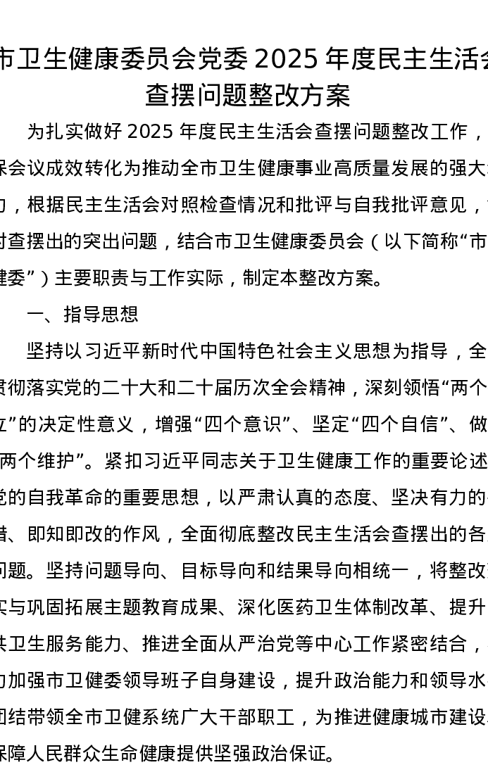 市卫生健康委员会党委2025年度xxxxx查摆问题整改方案