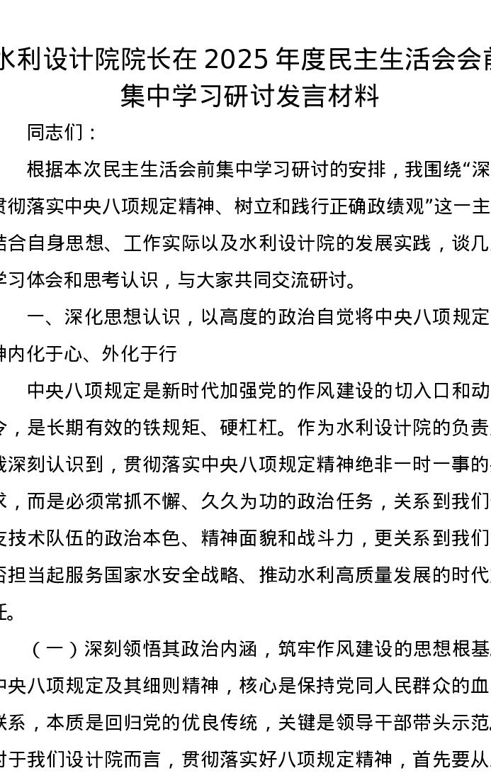 水利设计院院长在2025年度xxxxx会前集中学习研讨发言材料