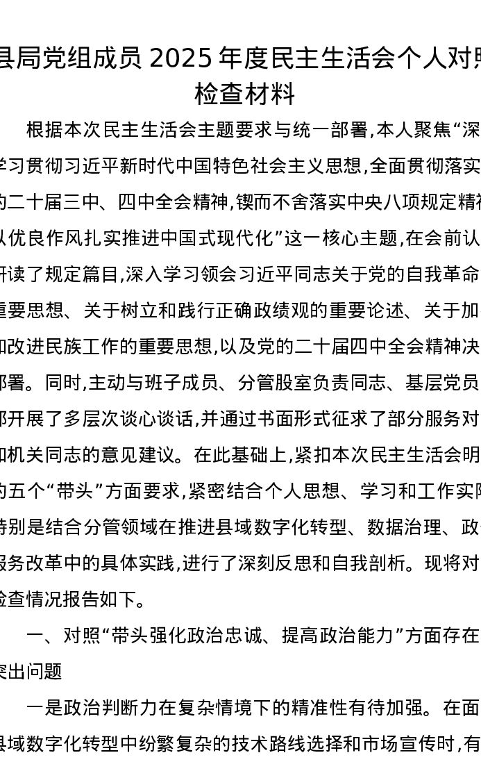 县局党组成员2025年度xxxxx个人对照检查材料
