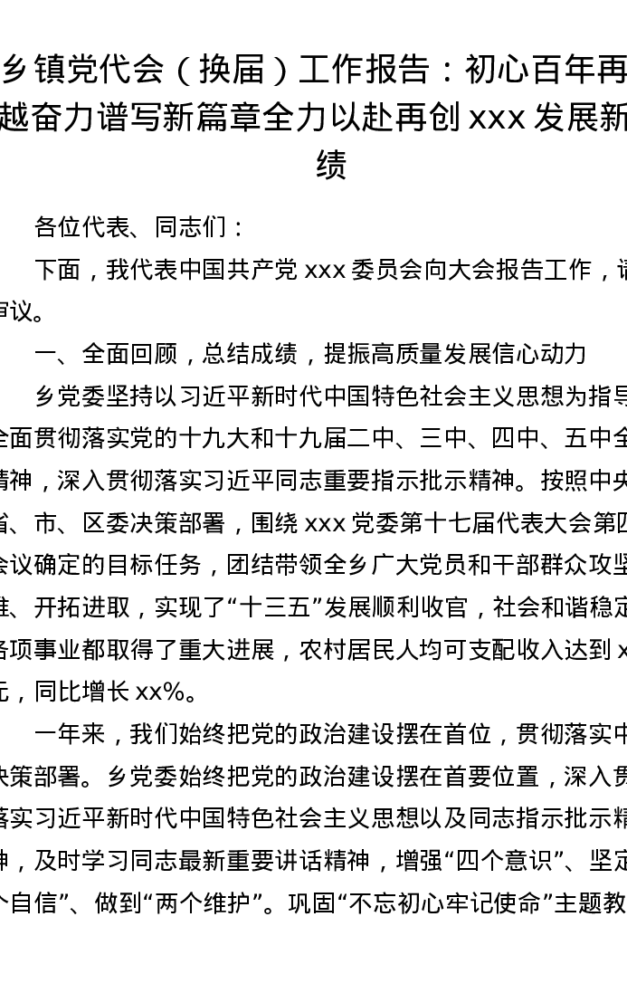 乡镇党代会(换届)工作报告:初心百年再跨越 奋力谱写新篇章 全力以赴再创xxx发展新佳绩
