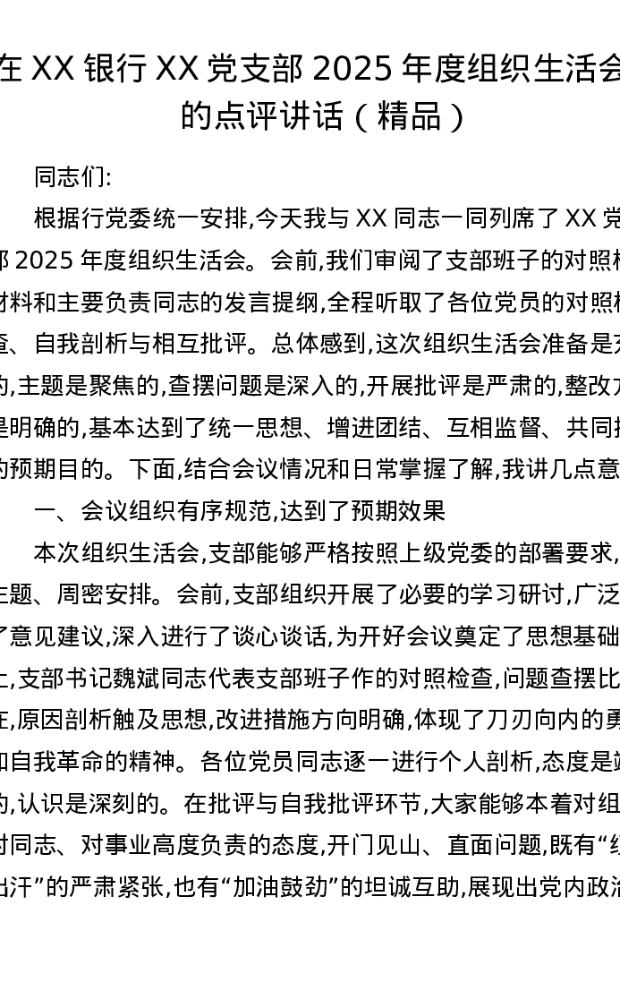在XX银行XX党支部2025年度组织xxx上的点评讲话