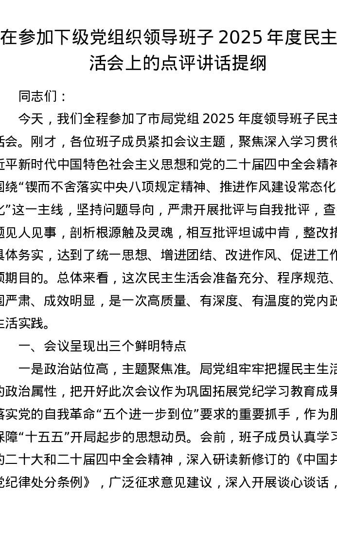 在参加下级党组织领导班子2025年度xxxxx上的点评讲话提纲
