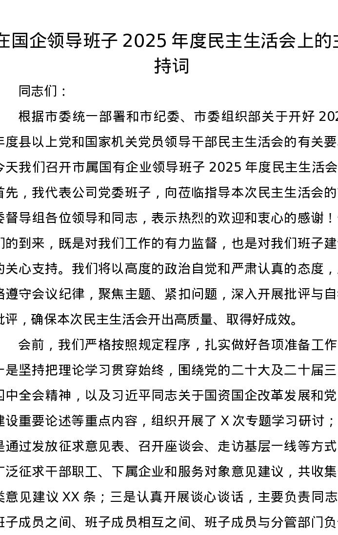 在国企领导班子2025年度xxxxx上的主持词