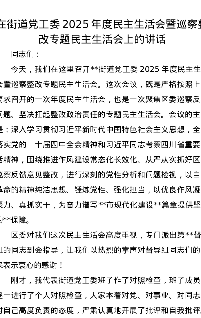 在街道党工委2025年度xxxxx暨巡察整改专题xxxxx上的讲话
